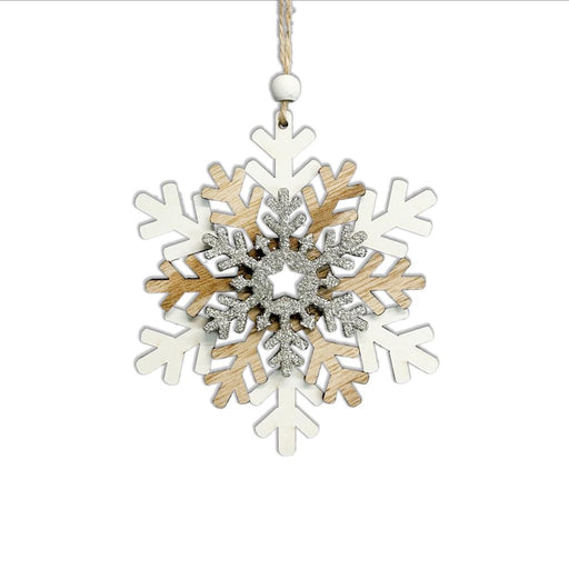 Lovely 2-layer wooden snowflake hanging decoration Wood and white finish with a silver glitter central snowflake Perfect tree, wreath, and craft d...