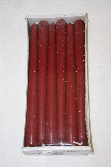Box of 12 burgundy tapered candles Good quality candles that burn evenly and reliably 100% made in Germany Approx 250 mm x 23 mm Burn time per ...