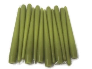 Box of 12 olive green tapered candles Good quality candles that burn evenly and reliably 100% made in Germany Approx 250 mm x 23 mm Burn ti...