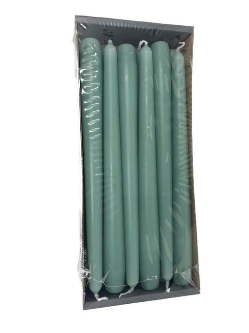 Box of 12 soft green tapered candles Good quality candles that burn evenly and reliably 100% made in Germany Approx 250 mm x 23 mm Burn tim...