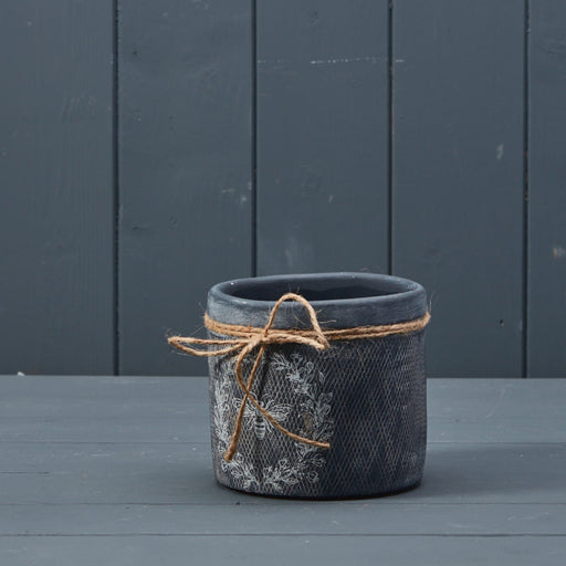 Charming vintage white bee print ceramic pot Rustic black pot finished with a twine bow Lovely container for a small flower or plant Perfect ...