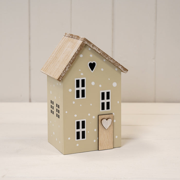 Light Sage Green Wooden House with Cut Out Heart - Height 17.5cm