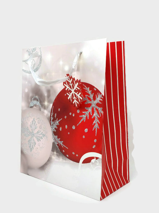 Seasonal Christmas gift bag Festive bauble design Sparkling embossed silver glitter decoration White satin ribbon handle with a snowflake tag Meas...