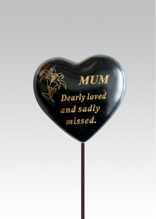 Black & Gold heart graveside stone Etched gold Lily flower with text 'Mum dearly loved and sadly missed ' Durable and weatherproof resin heart...
