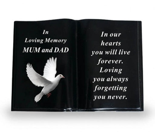 Black memorial book with a white dove  'In Loving Memory MUM and DAD In our hearts you will live forever Loving you always forgetting you never'...