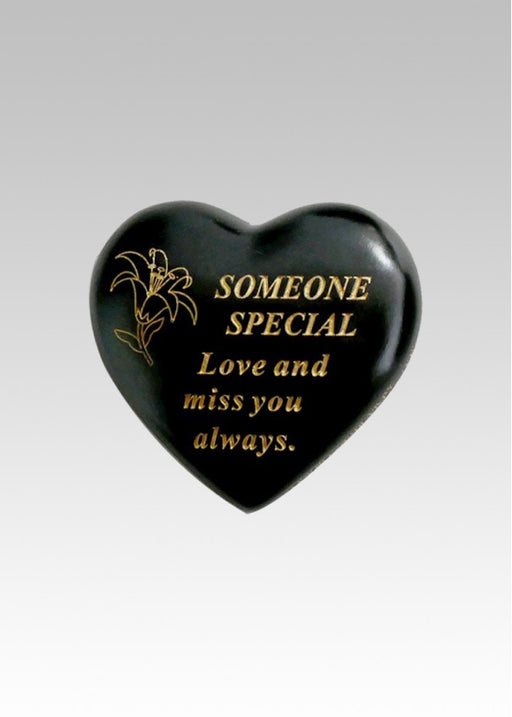 Black & Gold heart graveside stone Etched gold Lily flower with text Durable and weatherproof resin heart Heart measures approx 8 x 8cm