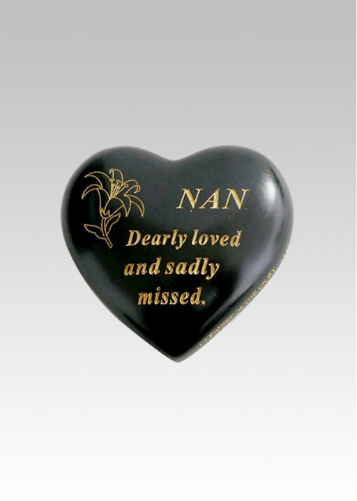 Black & Gold heart graveside stone Etched gold Lily flower with text 'Nan dearly loved and sadly missed ' Durable and weatherproof resin heart...