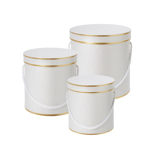 Elegant set of 3 tall lined hat boxes with rope handles Beautiful white with a gold trim Stylish container for flower and gift display Plastic r...