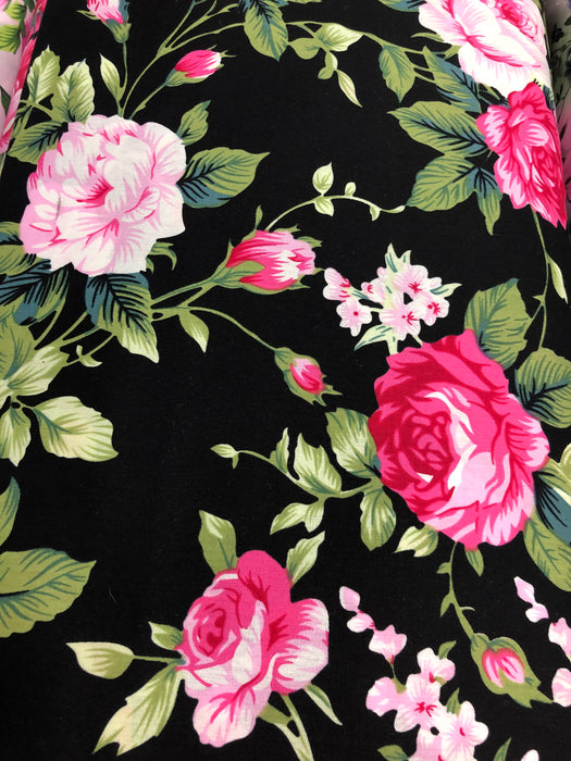 Black 100% Cotton with Cerise & Pink Blooming Roses 150cm Wide