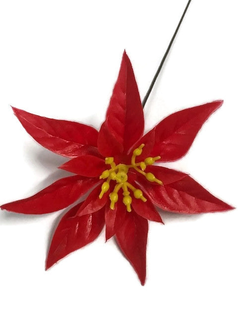 One hundred individual bendy wired stem of plastic poinsettia. Perfect for all sorts of christmas crafts, fab for wreaths and outdoors Head measures roughly 10cm, and pick length is about 20cm, measurements are approx |