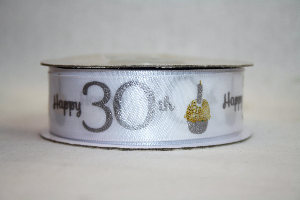 Happy 30th Gold & Silver on White Satin Birthday Ribbon 25mmX20M