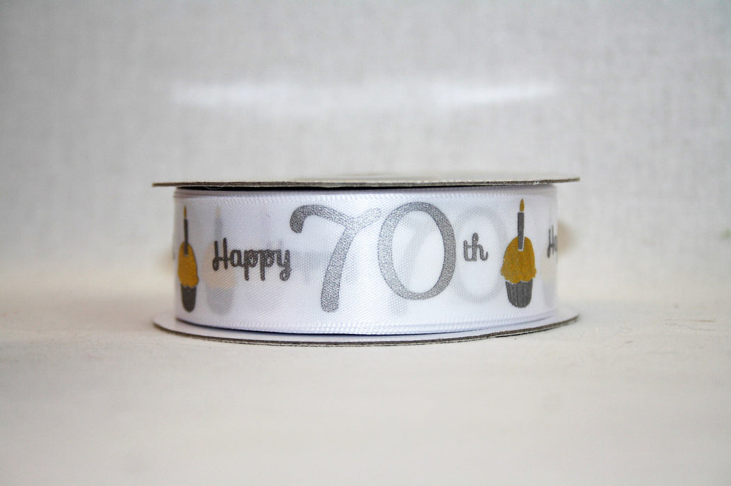Happy 70th Silver & Gold on White Satin Birthday Ribbon 25mmX20M