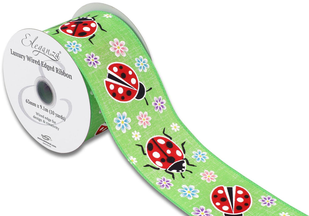 Wired Edge Ribbon 63mm x 9.1m - Floral Ladybird Lime Green